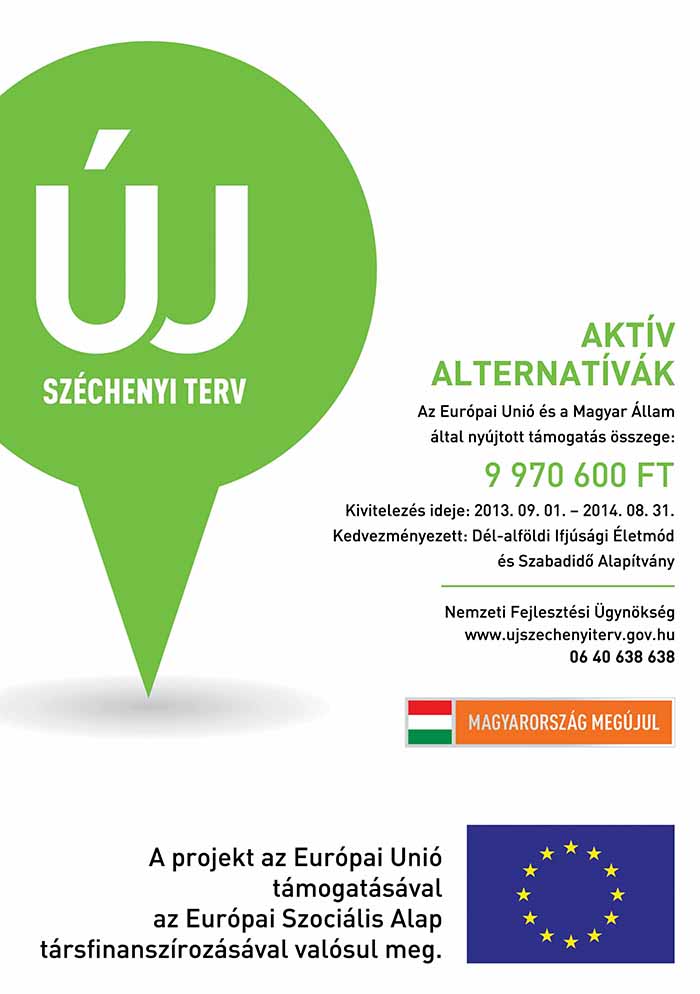 A Dél-alföldi Ifjúsági Életmód és Szabadidő Alapítvány támogatást nyert a Társadalmi Megújulás Operatív Program Egészségre nevelő és szemléletformáló életmód programok - lokális színterek (Kódszám: TÁMOP-6.1.2/11/1) című pályázati felhívásra beadott Aktív Alternatívák című pályázatával.